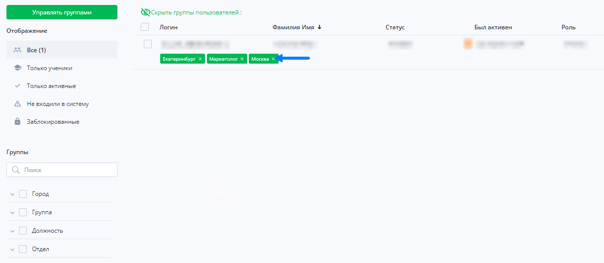 У каждого в списке отобразится список его подгрупп - нажав на крестик рядом с названием подгруппы, можно ее открепить от пользователя: