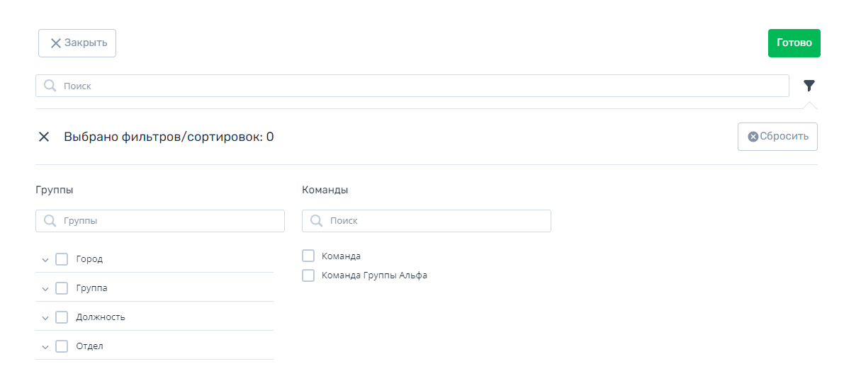 Фильтрация. Возможность отфильтровать список всех пользователей по доступным фильтрам: группы, подгруппы, команды;